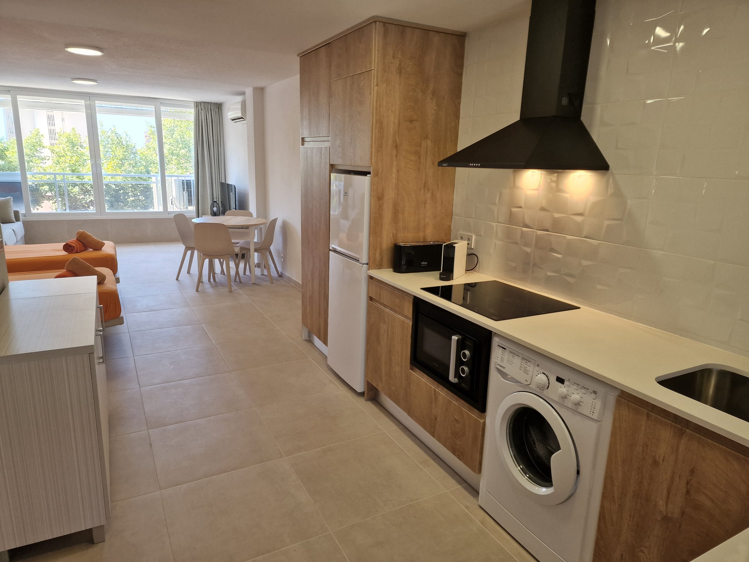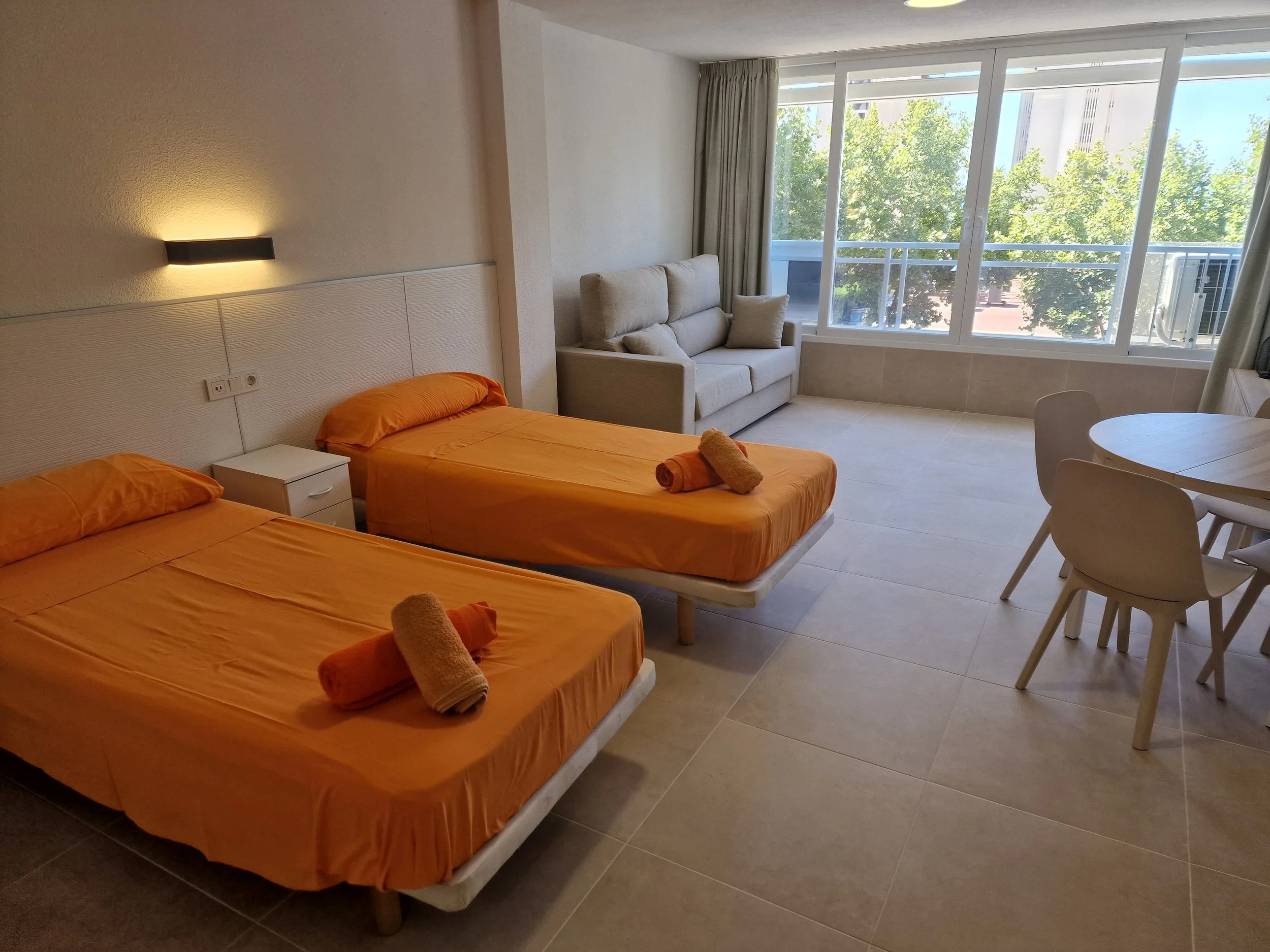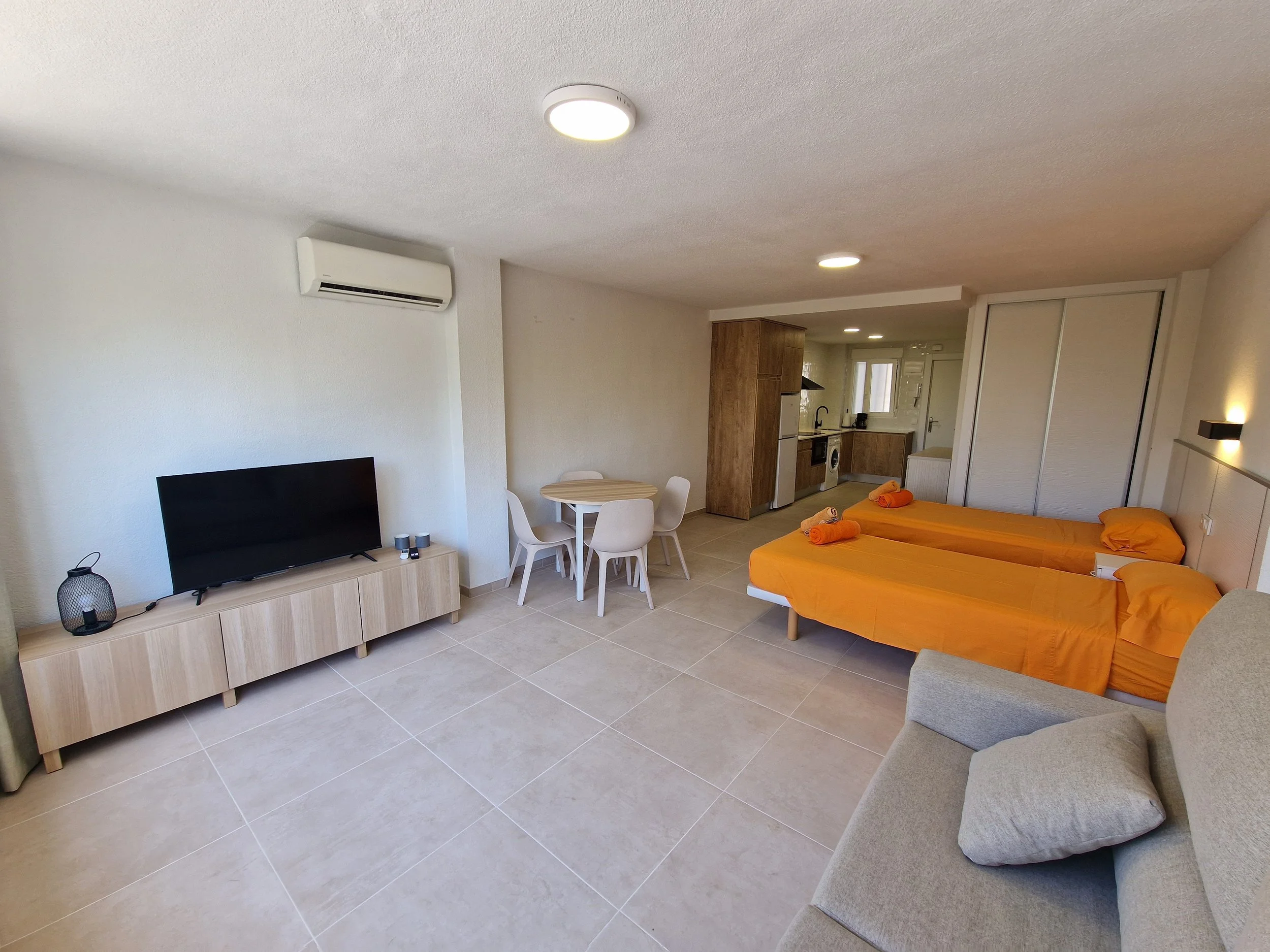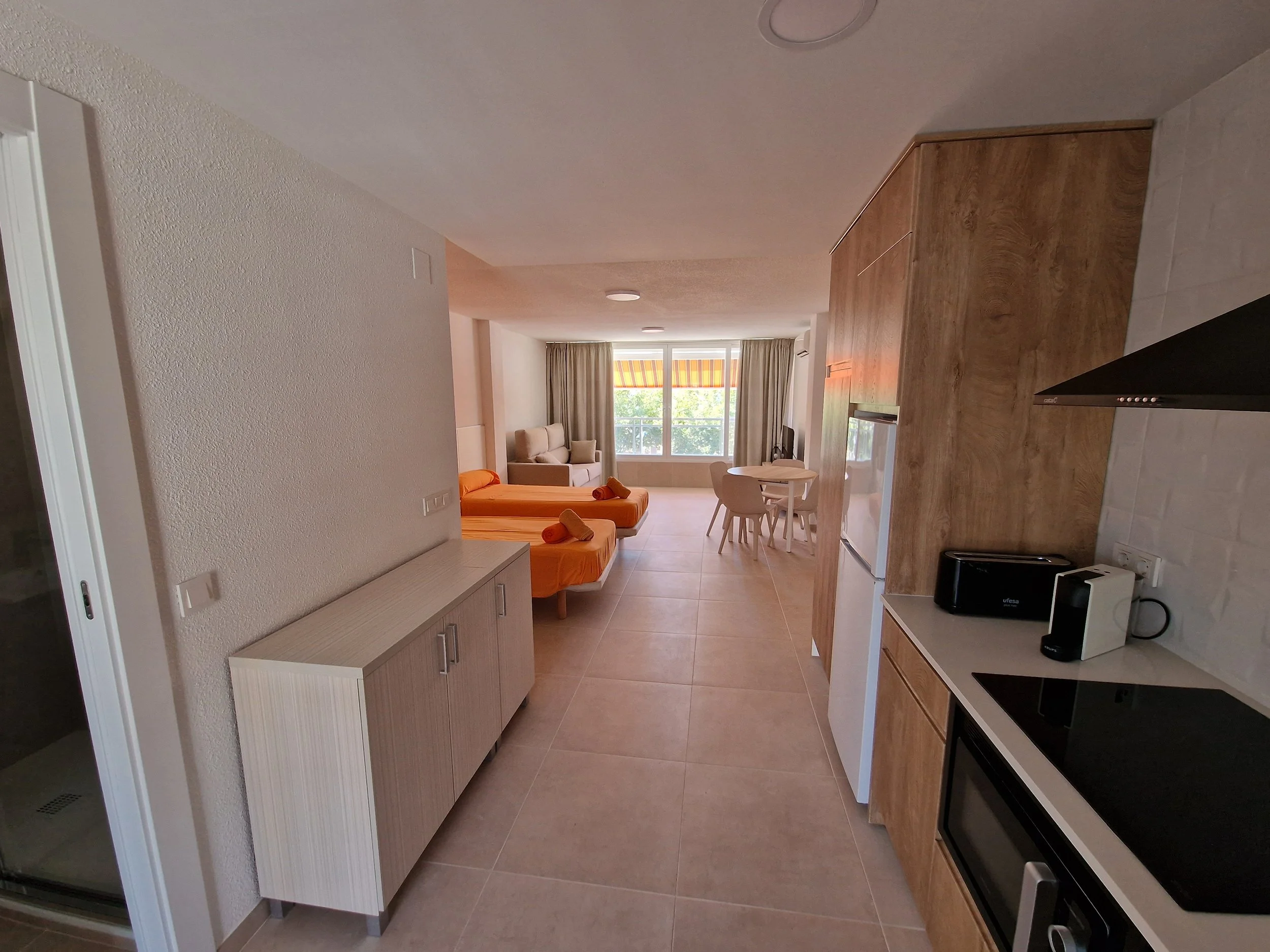 40m² studio with sea views, full bathroom with shower, spacious equipped kitchen, living room with double sofa bed and two single beds, wardrobe storage.