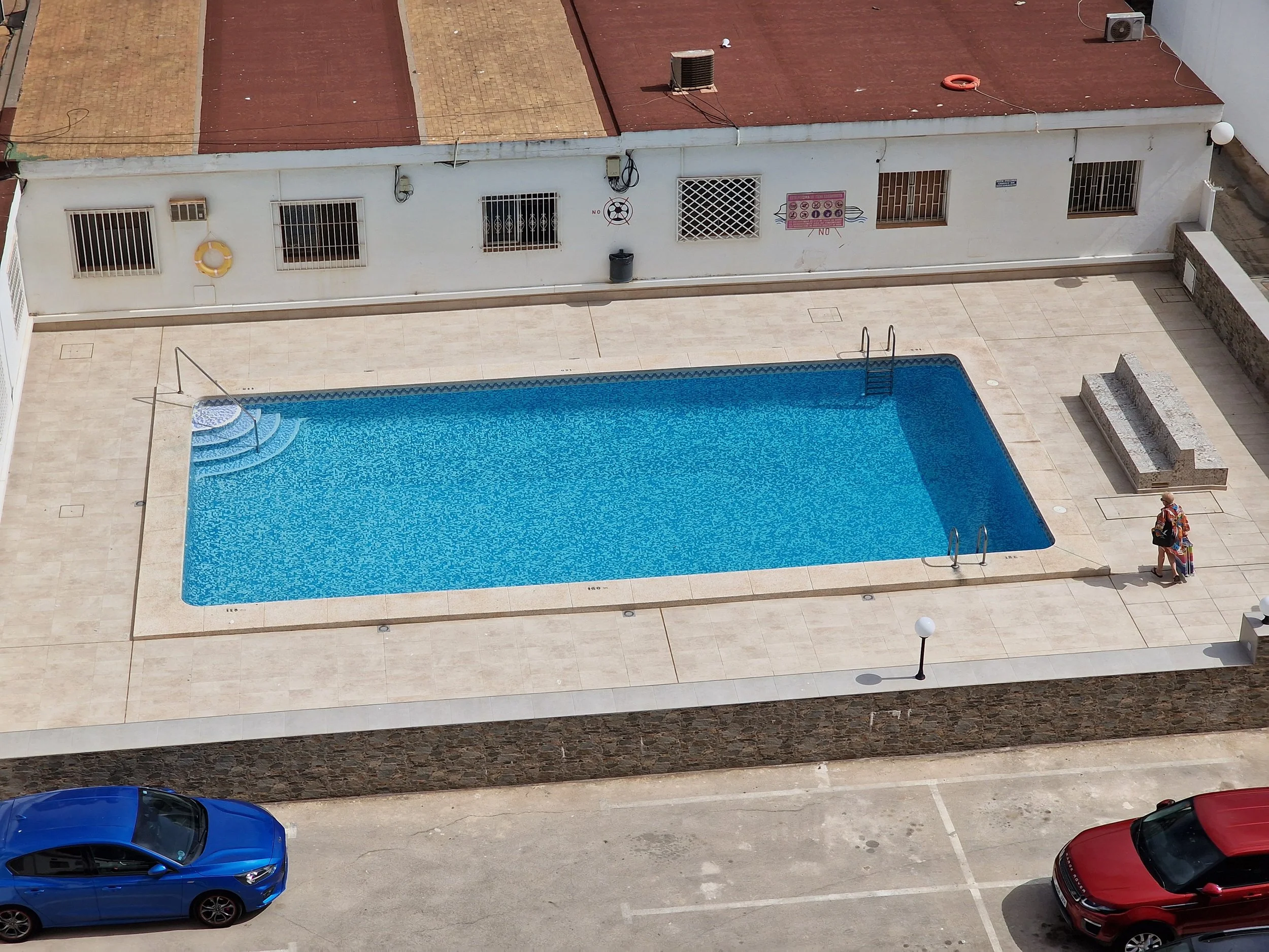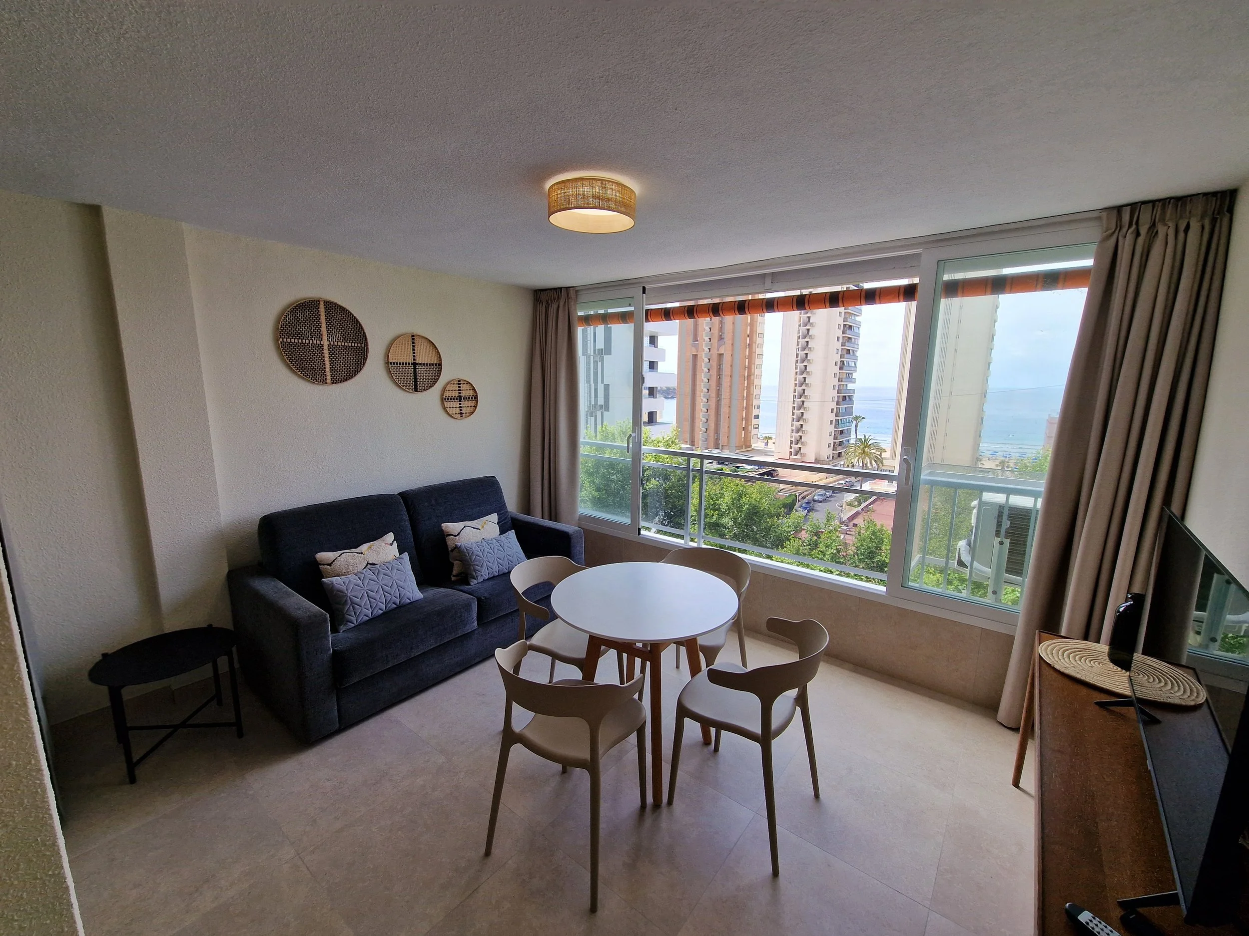 40m² studio with sea views, full bathroom with shower, spacious equipped kitchen, living room with double sofa bed and two single beds, wardrobe storage.