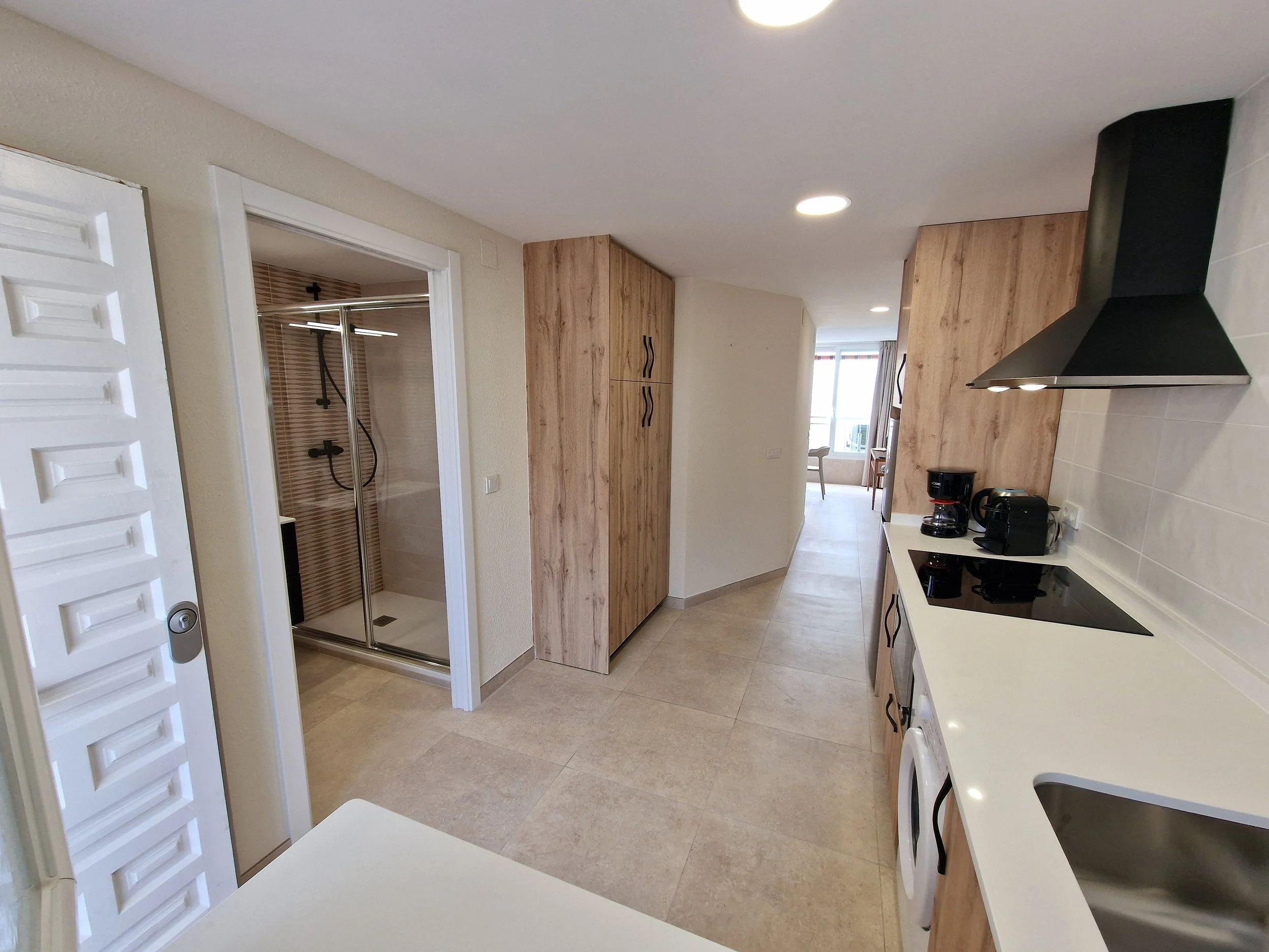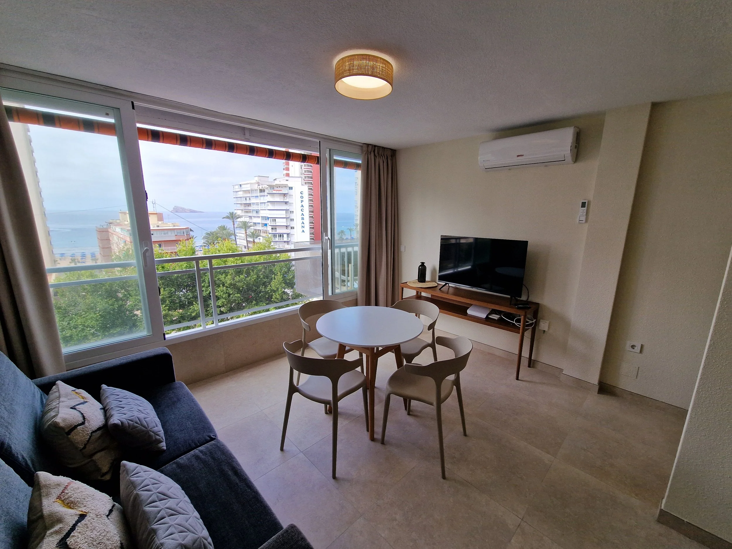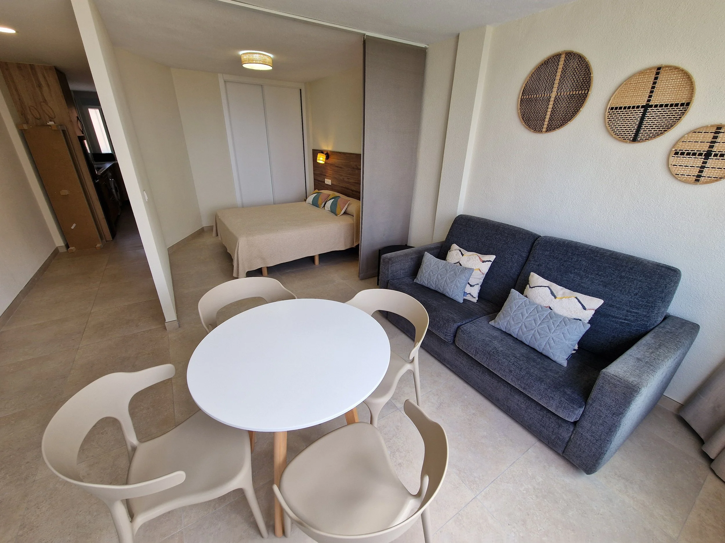 Studio de 40m² avec vue sur la mer, salle de bain avec douche, cuisine spacieuse et équipée, salon avec lit canapé double et lit matrimonial, placard.